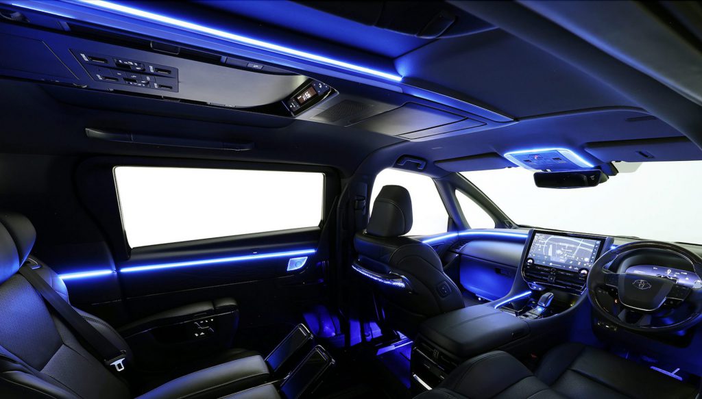 アルファードの純正ルーフアンビエントと「色」「照度」が連動。純正と見間違う車室内のライティング演出に寄与します。