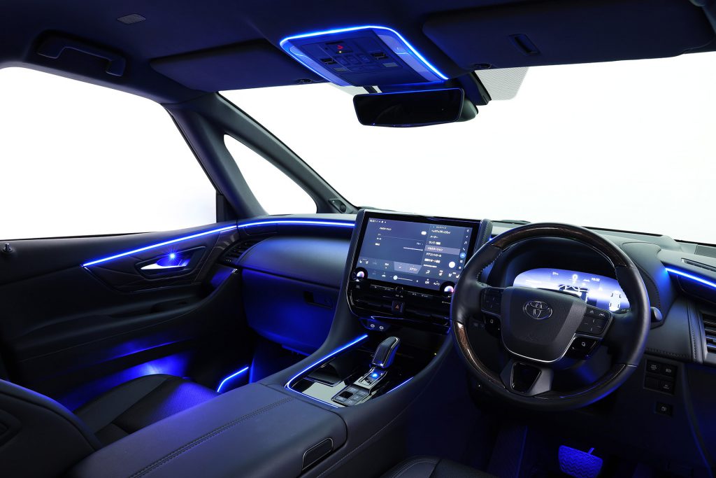 40アルファード用アンビエントライトは、インパネフロントラインやフロントドアデコラインから、リアは運転席と助手席下から後席の足元を照らす間接照明も設定。