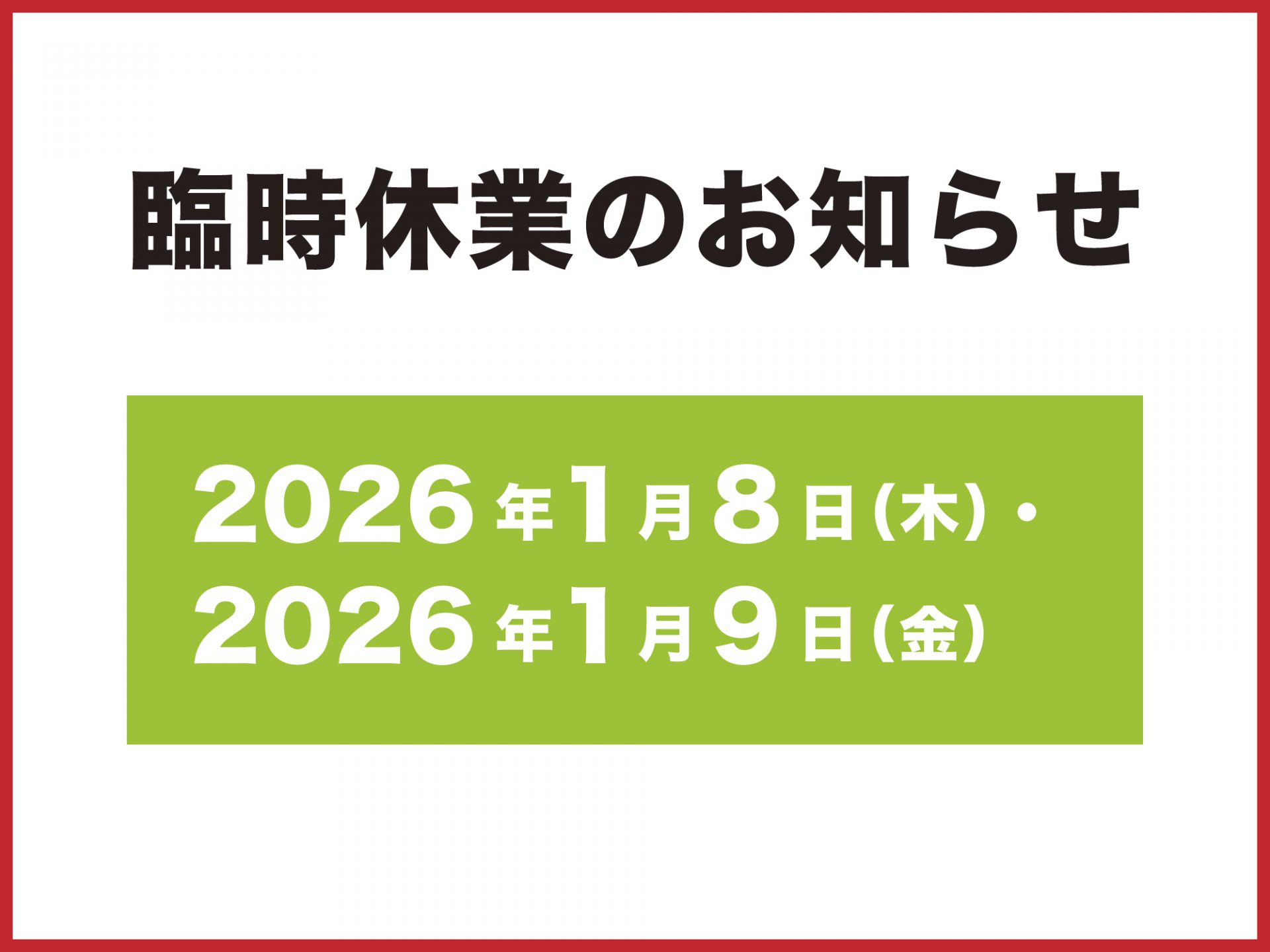1月8日(木) / 9日(金)の2日間を臨時休業とさせて頂きます。